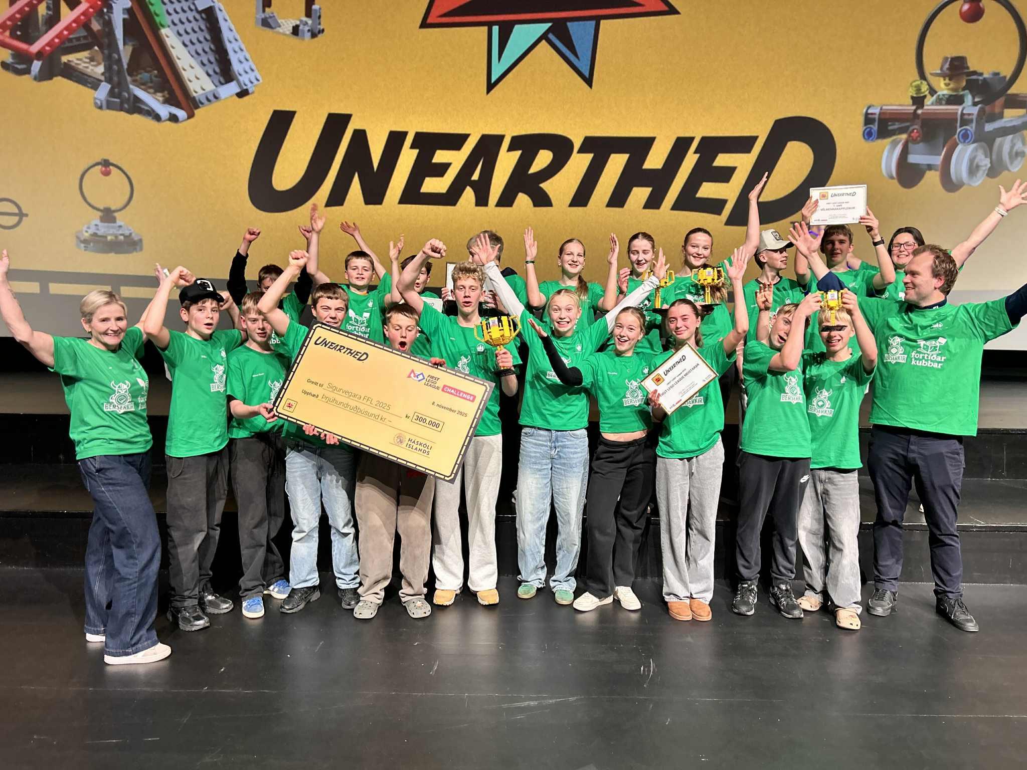 Unearthed. Bæði liðin helltu sér út í rannsóknir á fornleifafræði og komu í kjölfarið upp með tvö nýsköpunarverkefni. Fortíðarkubbar hönnuðu lítinn dróna sem hægt er að festa neðan í stærri dróna. Litli dróninn getur bæði kafað (t.d. að skipsflökum), grafið og tekið myndir í sprungum. Berserkir hönnuðu box sem þau kalla ArcheoBox. Boxið tekur við fornmynjum og notar bæði skanna og kolefnisgreiningu til þess að áætla ýmsa þætti munarins, svo sem rakastig, aldur og þekkta fundarstaði. Öllum upplýsingum er svo safnað í gagnagrunn sem og er miðlað með Minjastofnun Íslands. Í liðunum tveimur voru samtals 19 nemendur sem hafa síðustu mánuði lagt líf og sál í þetta verkefni. Þau hafa eytt vetrarfríinu sínu í skólanum og allir dagar síðustu vikur hafa farið í verkefnið. Þessi mikla vinna skilaði svo heldur betur árangri þann 8. nóvember s.l. þegar liðin tvö sópuðu til sín verðlaunum í Háskólabíói. Fortíðarkubbar lentu í þriðja sæti í nýsköpunarverkefninu sínu, Berserkir fengu fyrstu verðlaun fyrir liðsheild, og saman deildu þau fyrsta sætinu í vélmennakappleik, en bæði lið fengu hæst 370 stig í þeirri þraut. Að lokum voru það svo Berserkir sem báru sigur úr bítum í heildar stigafjölda keppninnar, en Fortíðarkubbar lentu í öðu sæti. Þess má til gamans geta að FLL keppnin á Íslandi er 20 ára í ár og hefur Grunnskóli Hornafjarðar tekið þátt frá upphafi, og er sigursælasti skóli landsins en sigurinn hefur 5 sinnum fallið okkur í skaut. Þau hafa því unnið sér inn þátttökurétt á mót erlendis, og er stefnan sett á keppni í vor. Næstu mánuðir fara í að bæta forritun þjarkanna, gera nýjar kynningar á ensku og að þróa frumútgáfur af rannsóknarverkefnum okkar. Við erum heldur betur stolt af nemendum okkar og hlökkum til að fylgja þeim áfram í þessu verkefni.