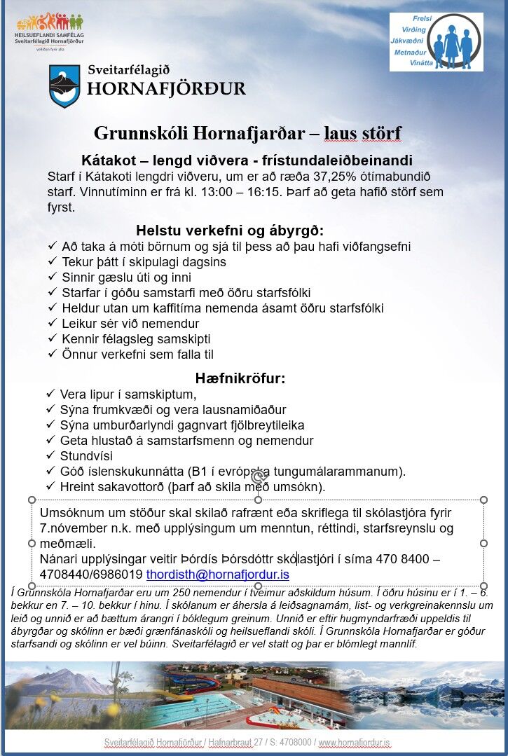 Starf í Kátakoti lengdri viðveru, um er að ræða 37,25% ótímabundið starf. Vinnutíminn er frá kl. 13:00 – 16:15. Þarf að geta hafið störf sem fyrst.